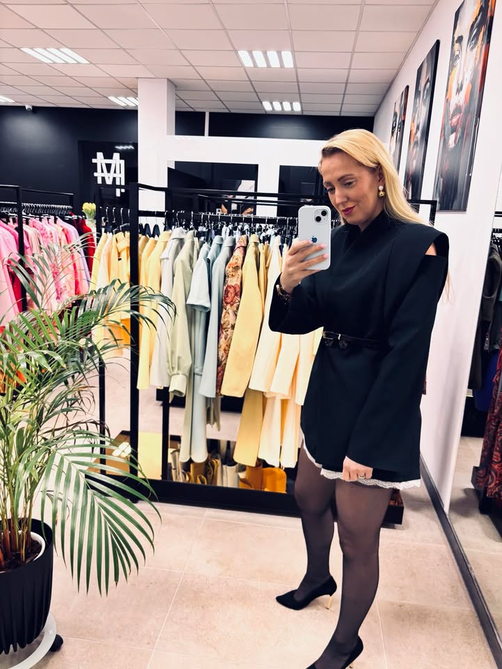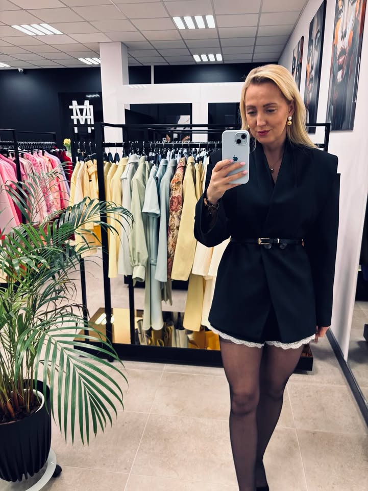 Czarna oversizowa marynarka ze stójką, z opadającymi rękawami.