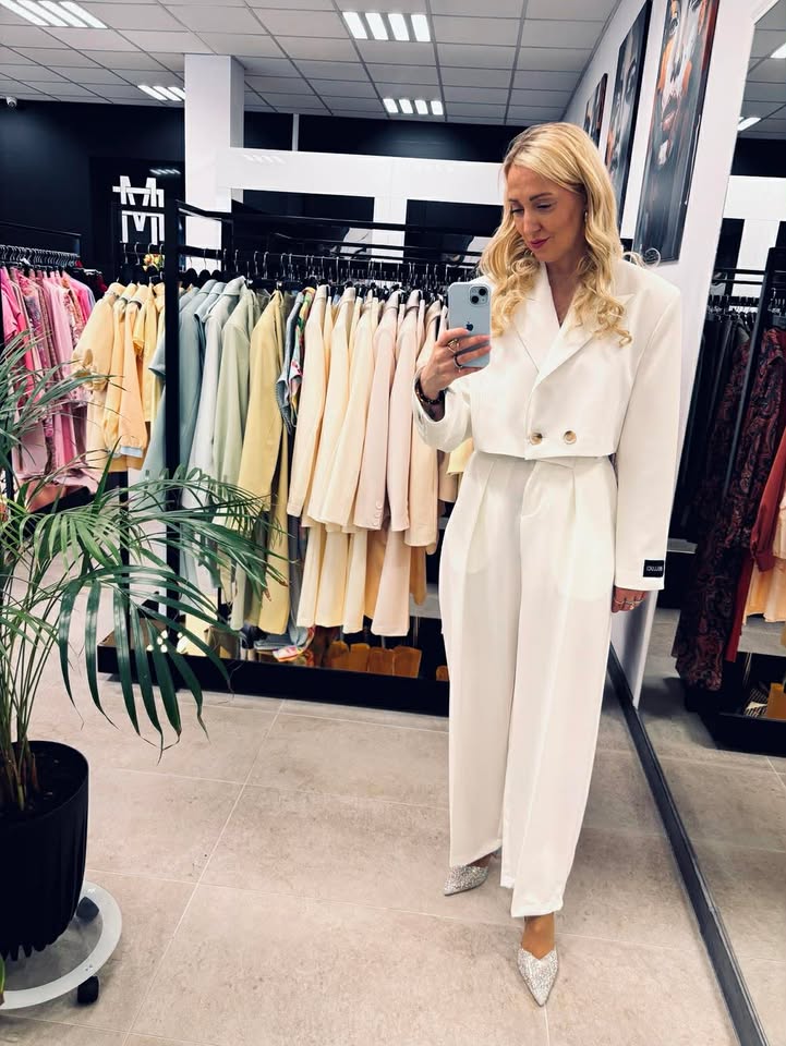 Śmietankowy garnitur: krótka marynarka w rozmiarze UNI+ spodnie typu ballon (rozmiarówka)
