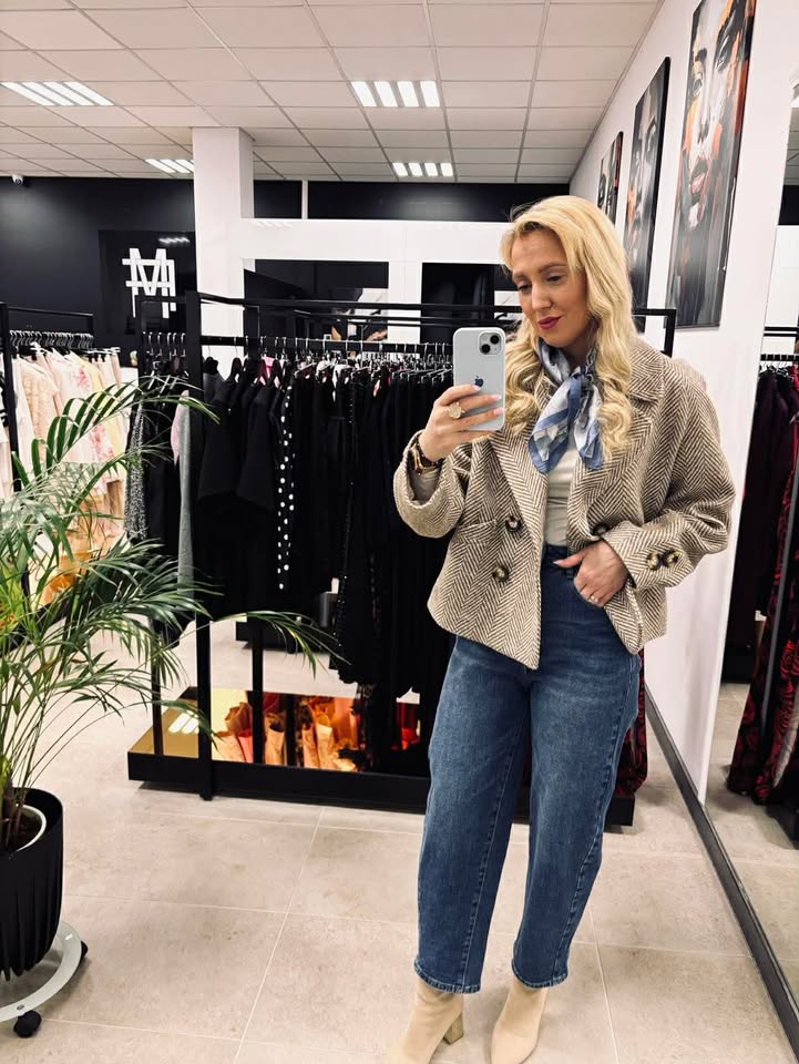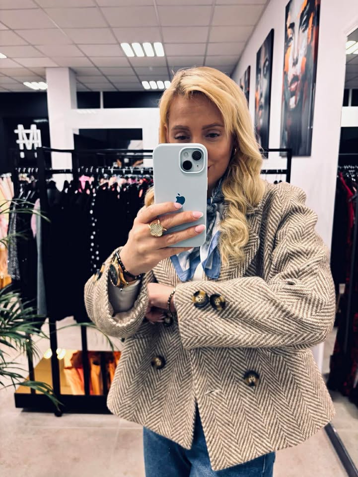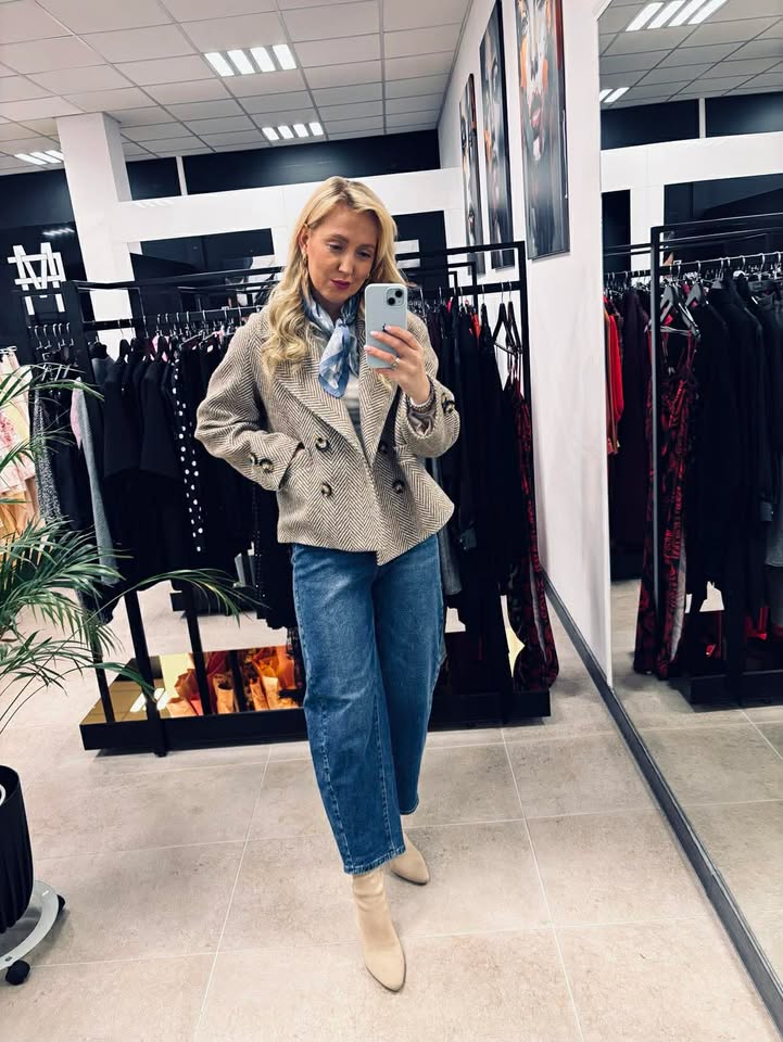 Krótki wiosenny płaszcz w jodełkę, zapinany na dwurzędowe guziki.