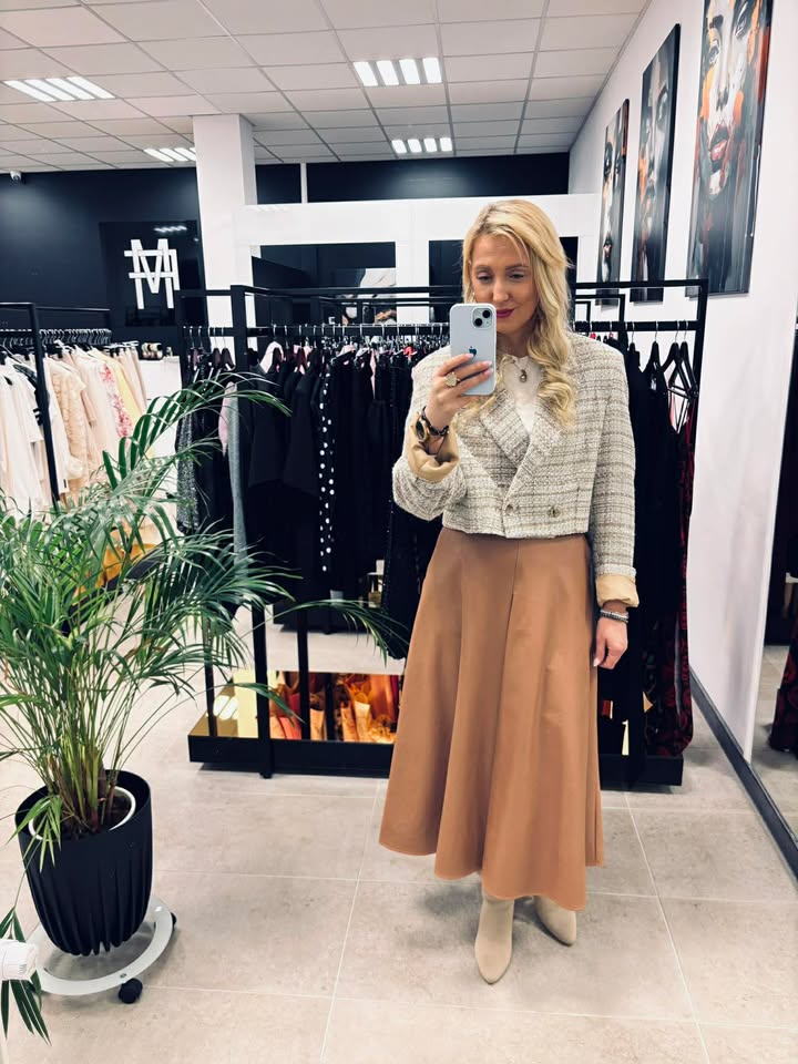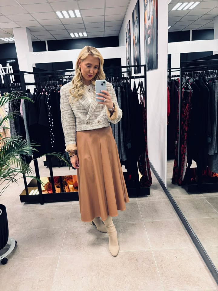 Spódnica midi z eko-skóry w kształcie literki A, z zapinanym zamkiem na boku, z kiszeniami.
